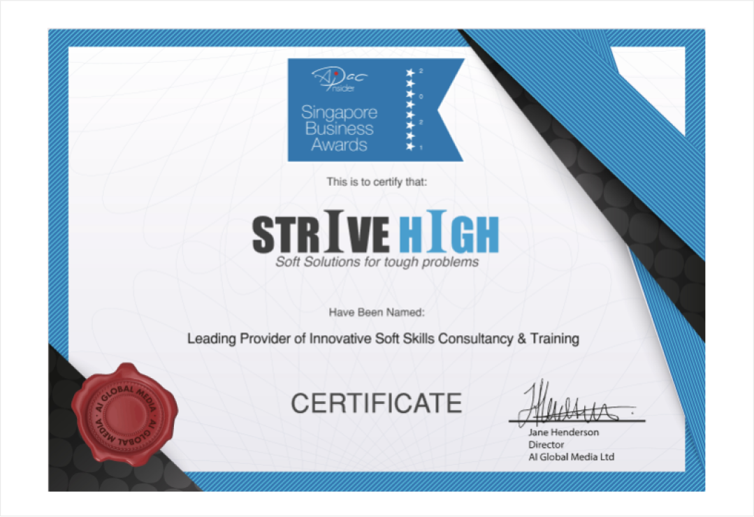 Strive-High is a globally recognized soft skills consultancy and training company based in Singapore. With over a decade of experience, a presence in 18+ countries, and expertise across 7 industries, we have partnered with organizations to deliver 15,000+ successful training interventions.
